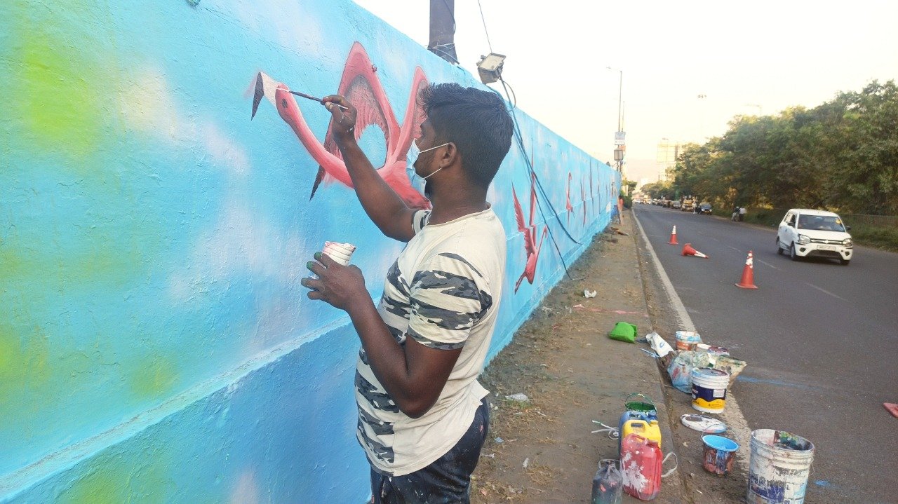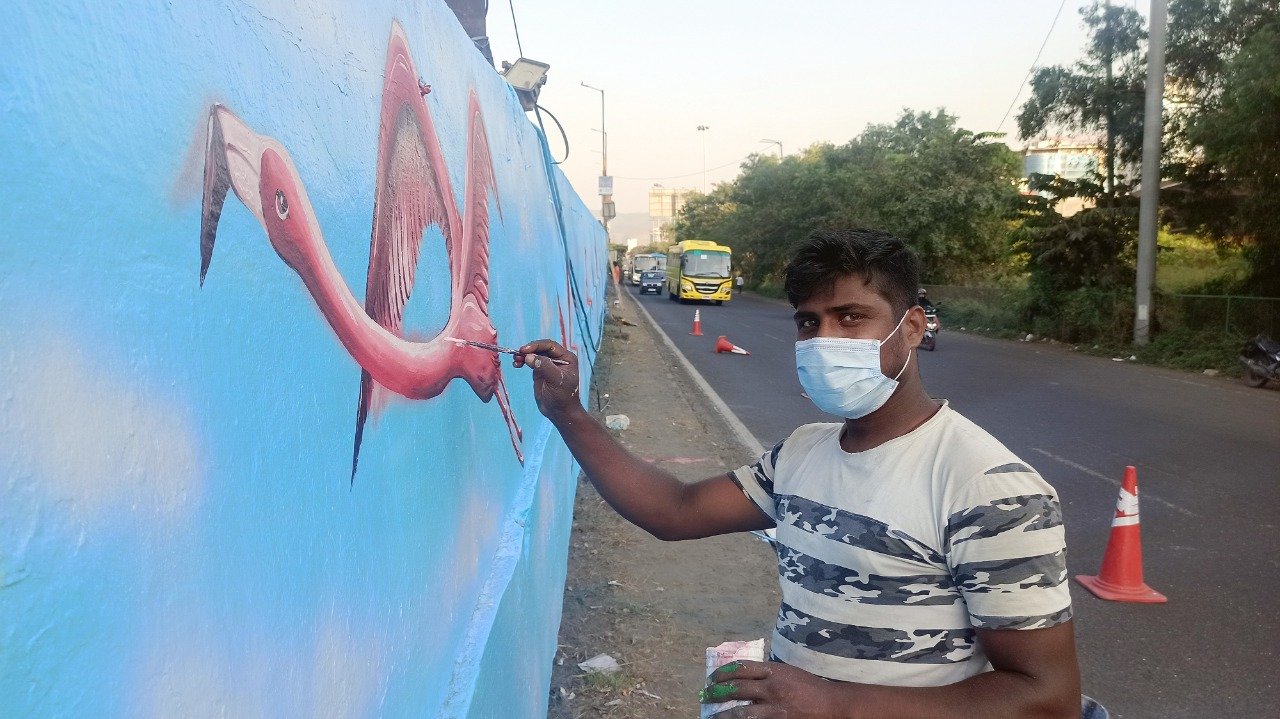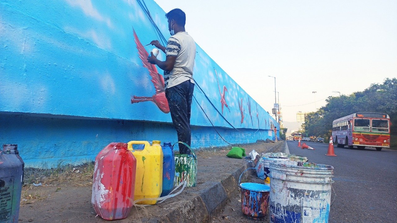 An artist giving final touchs to his flamingo artwork on a public wall as a part of the Mumbai beautification drive by Photo Editor Mohammed Asif