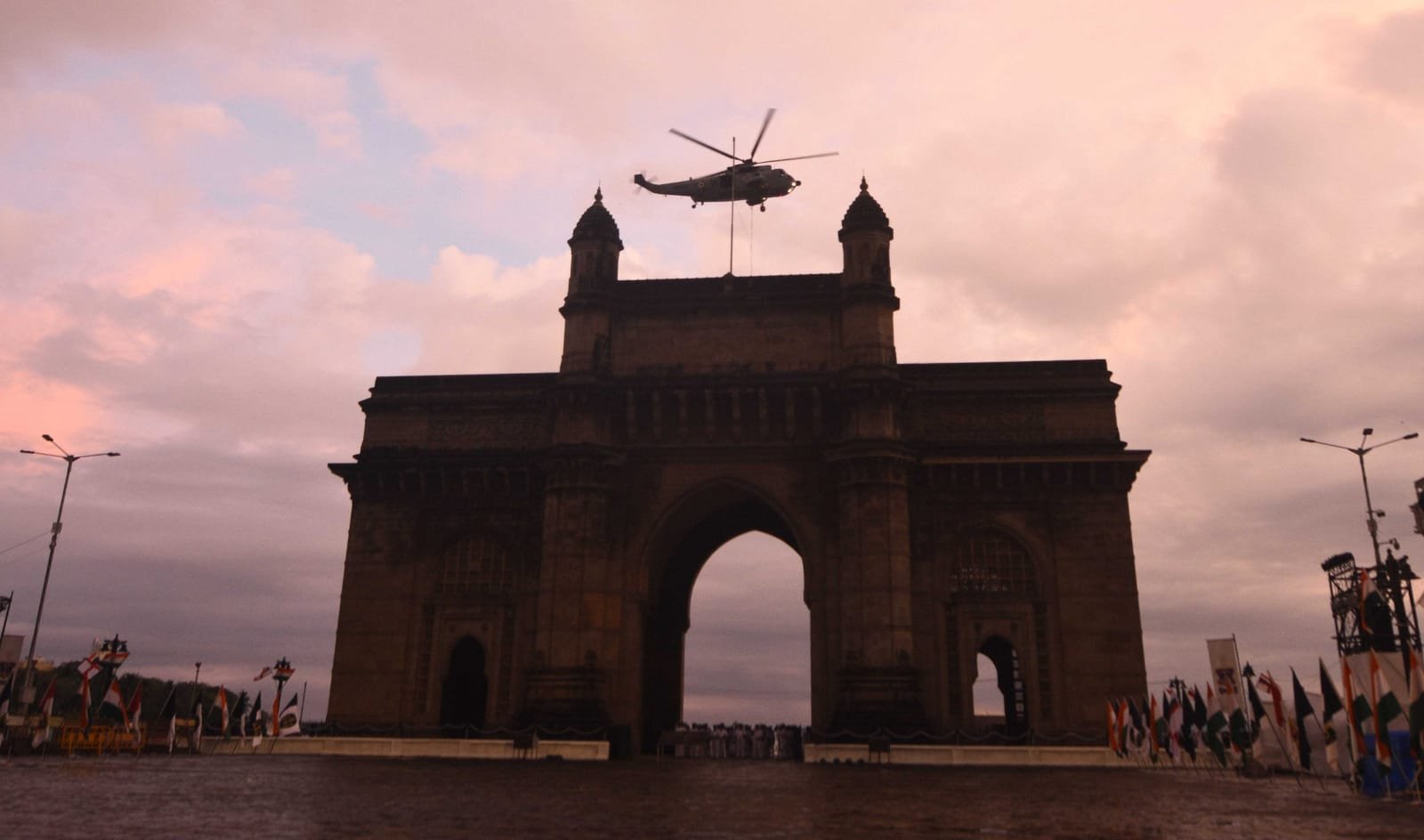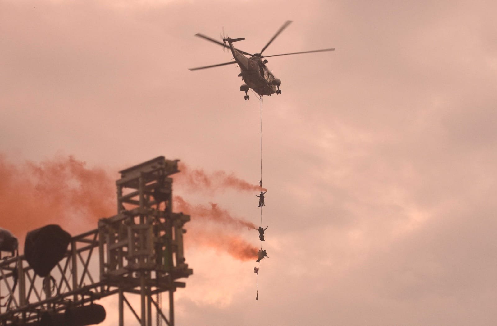 Indian Navy commandos descend on a rope from a helicopter over the Arabian Sea as they rehearse for Navy Week in Mumbai